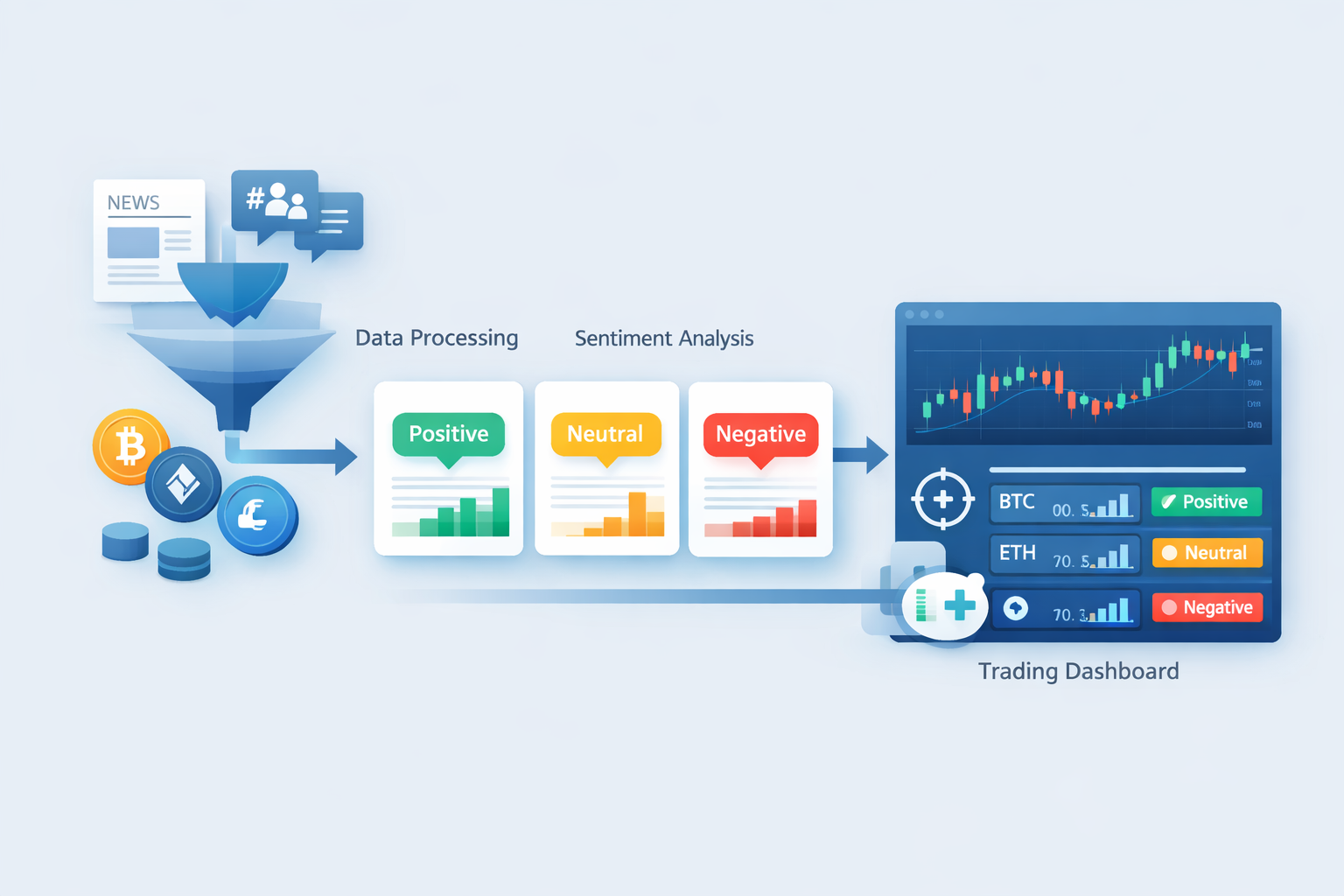 Financial Services Operations · Trading & RiskWe built a system that extends an existing trading platform with an additional signal for traders: market sentiment per asset. The system scrapes the web for news, social chatter, and other public sources, then derives and suggests market sentiment for each crypto token (or other traded asset). Traders get an extra, data-driven input alongside price and volume—so they can factor in what the market is "feeling" about each token without manually scanning the web.