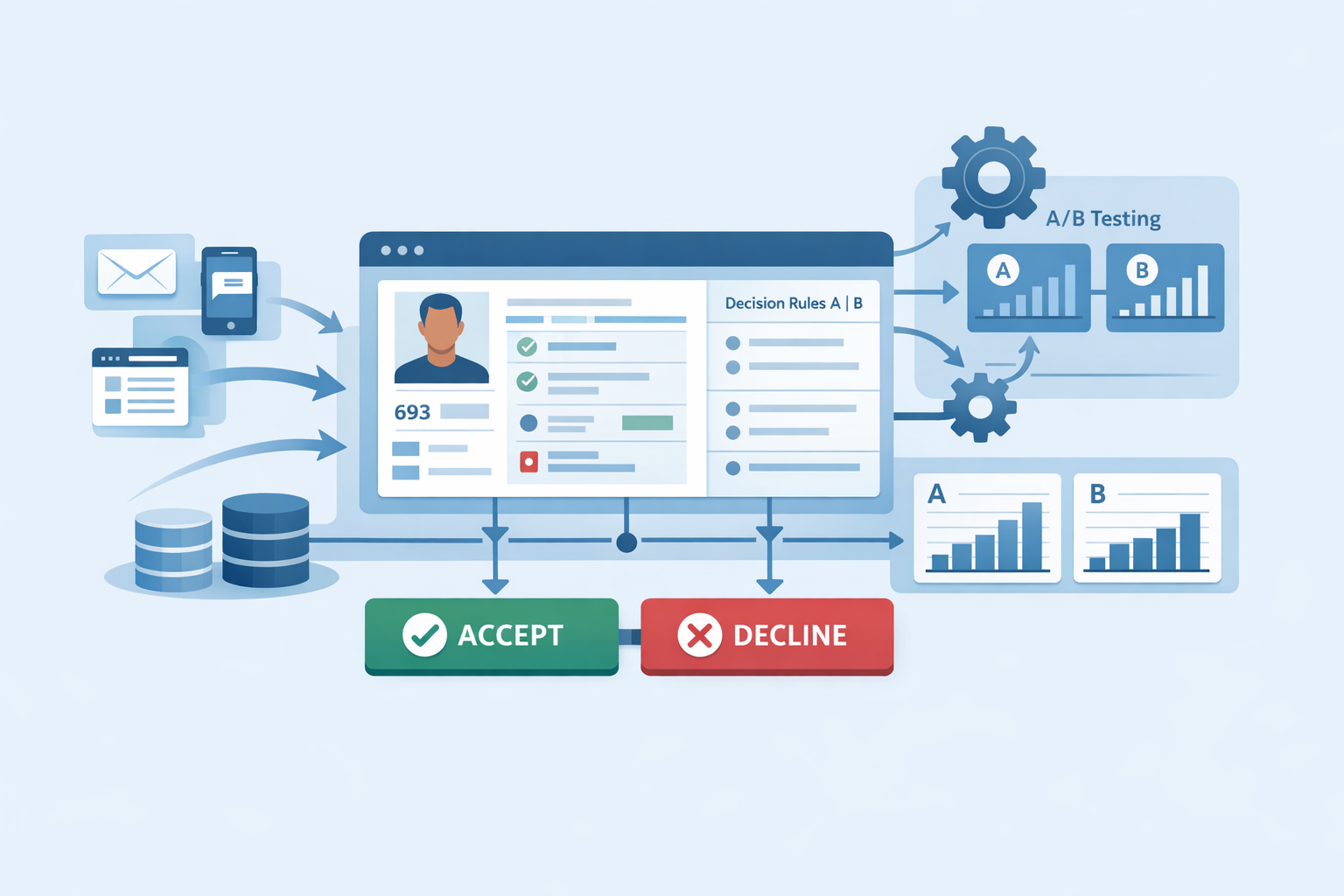 Financial Services Operations · Lending · Risk & ComplianceWe designed and specified an operational underwriting workflow system for a major US payday lender. The system gives the underwriting team a single, rule-driven interface to process leads end-to-end: from lead intake to an accept/decline decision, with business rules, credit bureau integrations, and A/B testing fully configurable by operations—no engineering required for routine changes.